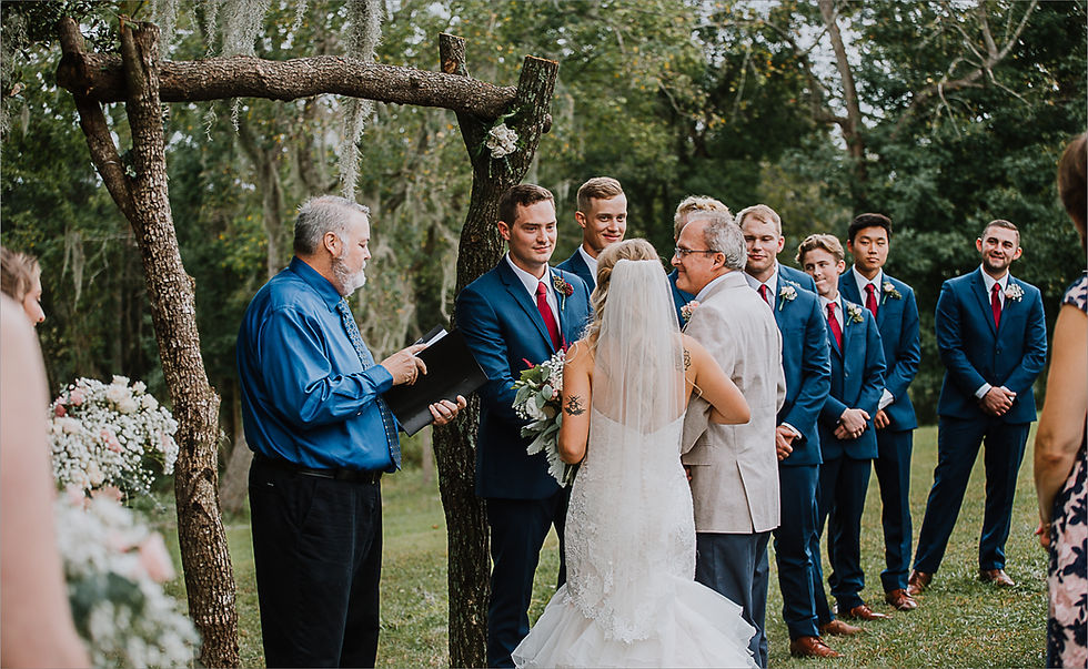 Ceremony Venue: The Barn at Red Gate, Savannah, Ga Florist: Azalea Ann' DJ: 5 Point Productions Cake: KM Cake Design